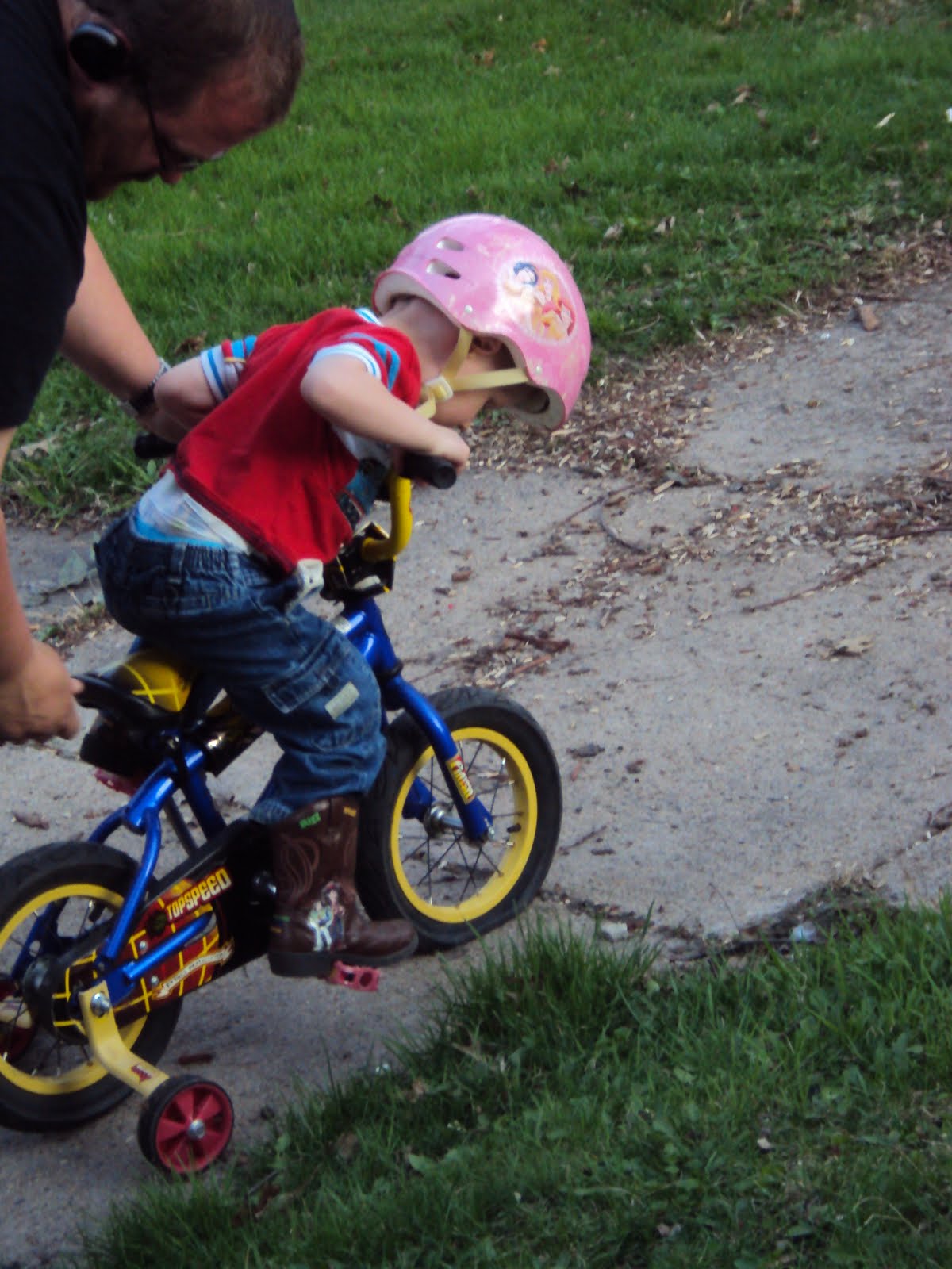 Daddy is helping Dietrich learn how to ride a bike. He was wearing Evelyn's helmet becasue we couldn't find his. We did find it later, and he was happy.